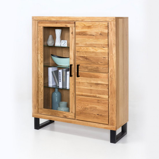 Wysokiej jakości bufet z kolekcji meblowej Alaska świetnie uatrakcyjni wygląd twojego salonu, jednocześnie zapewniając sporo miejsca na pamiątki czy talerze. Jego wyjątkową cechą charakterystyczną są metalowe nogi lakierowane na kolor czarny, które świetnie łączą się z pięknem naturalnego drewna dębowego.